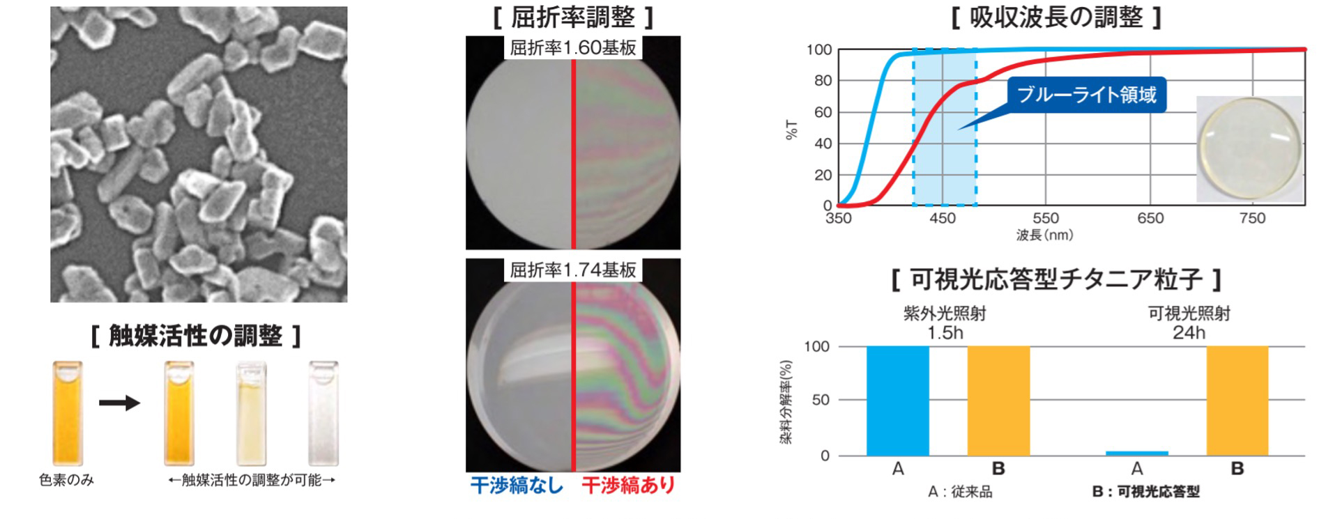 粒子径がナノオーダーで制御された高屈折率チタニア粒子の分散液。チタニア特有の光触媒活性が抑制されているため、眼鏡用高屈折率プラスチックレンズの高耐候性ハードコーティング材料として採用されている。また、チタニアの構造制御により、UVカットやブルーライトカット機能の付与も可能となる(図2)。さらに、屈折率と光触媒活性の精密制御により、電子ディスプレイ材料、光半導体分野材料等の光学材料用途や建材等のセルフクリーニング用途への応用展開も考えている。