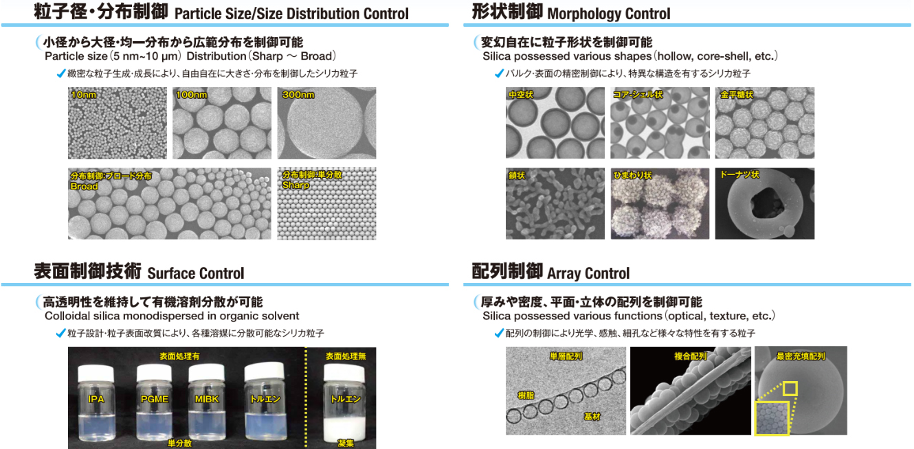 粒子径(5nm~ミクロンサイズまで)と粒度分布(シャープ~ブロード)の制御が可能であり、また、中空状、鎖状、金平糖状等の様々な形状制御にも対応できる。用途に合わせたサイズ、形状に制御された各種製品は、半導体基板の研磨砥粒、ディスプレイ、レンズ等の光学部材、化粧品等の幅広い分野で採用されている。また、ナノ粒子としての機能を十分に発揮するには、粒子の表面状態を制御し、有機溶剤等に単分散させて提供する必要がある。日揮触媒化成は各種溶剤にナノ粒子を分散させることができ、シリカ以外のナノ素材についても多くの知見を有している。さらに、粒子を規則的に配列したり複合化したりすることにより、単一粒子とは異なる新たな機能を付与することができる。