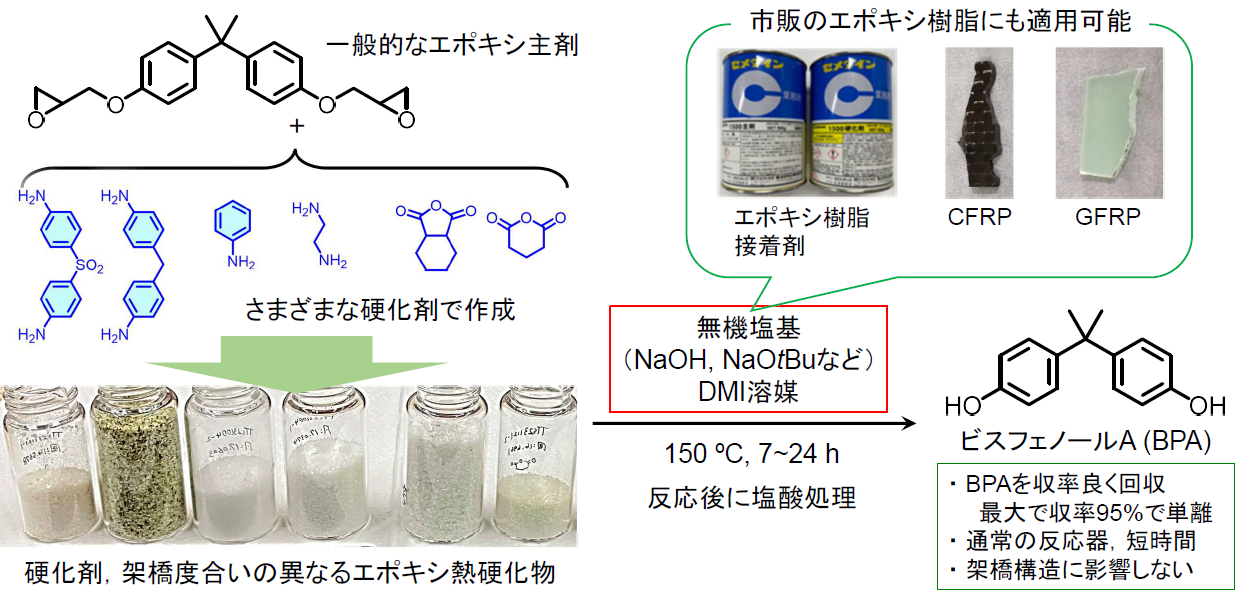 発表によれば、水酸化ナトリウムやtert-ブトキシナトリウムなどの塩基と、1,3-ジメチル-2-イミダゾリジノン(DMI)などの高沸点溶剤を用い、150℃で7時間という温和な条件でエポキシ樹脂原料のビスフェノールAが効率良く回収される(図4)。この方法はガラス繊維や炭素繊維で強化したエポキシ複合材料にも適用可能で、ビスフェノールAとともに強化繊維も回収できる。