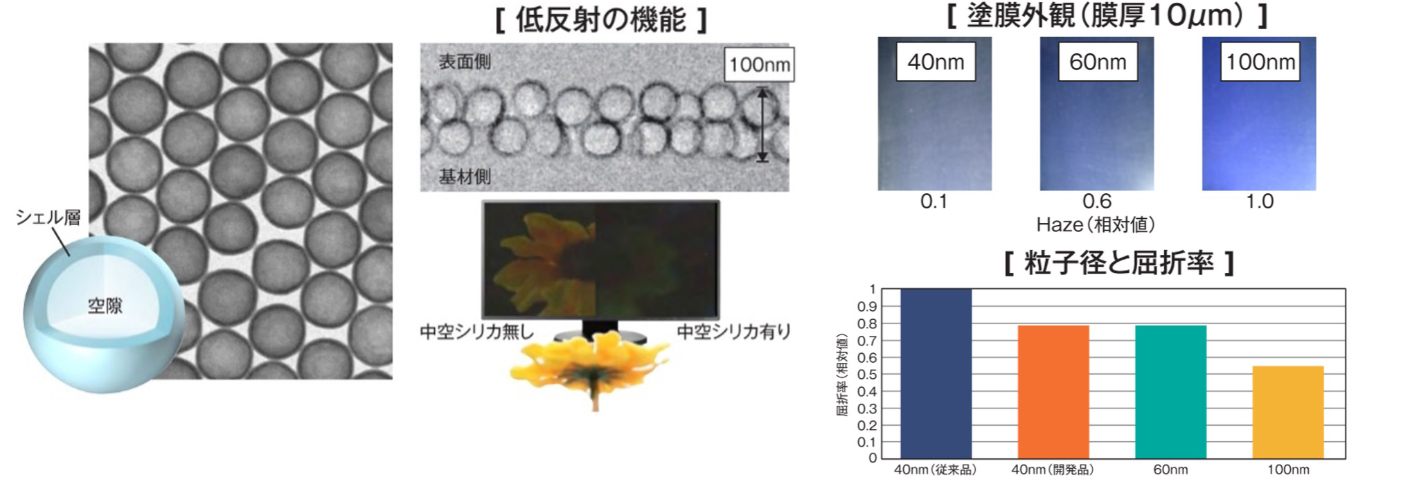 図1.中空シリカを用いた低反射機能膜、塗膜外観および粒子径と屈折率の関係