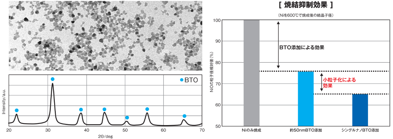 世界最小クラスBTO粒子の分散液。高い結晶性を示す高誘電率材料であるため、セラミックス分野では少量の添加で、焼結抑制効果が期待でき、次世代MLCC用Ni電極材料などの電子材料の小型化や高性能化に大きく寄与する(図3)。