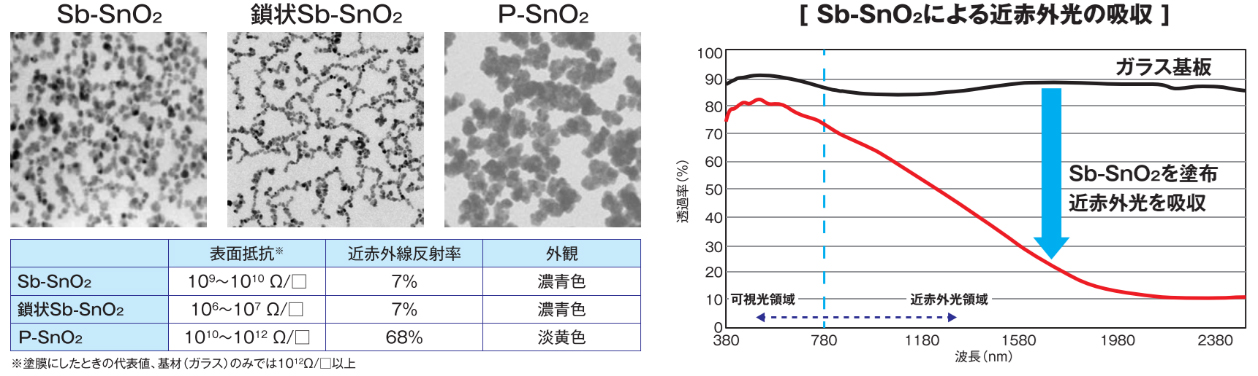 SnO₂にSbやPをドープした酸化スズ系粒子を帯電防止材、熱線吸収材として提供している(図4)。粒子同士を鎖状に繋げた特殊な構造により、少量の添加量での低抵抗化が可能となり高透明性にも寄与する。Sb-SnO₂は濃青色を示すが、P-SnO₂は淡黄色であるため、フィルム化した際の着色度合が小さいことも特徴である。また、熱線吸収効果を利用して自動車や衣類等への展開等も検討している。
