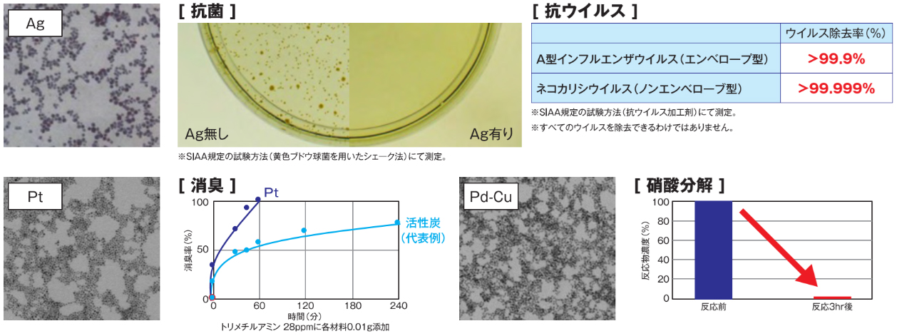 高純度で均一な粒子径を特徴とする金属ナノ粒子であり、単一金属、合金での調製が可能。ナノサイズの無機素材であるため、即効性と持続性に優れ、少量で抗菌、消臭等、各種機能を発揮する(図5)。特にAg系粒子は特定のエンベロープウイルス・ノンエンベロープウイルスのいずれにも不活化効果が期待されており、ライフサイエンス分野への展開も考えている。